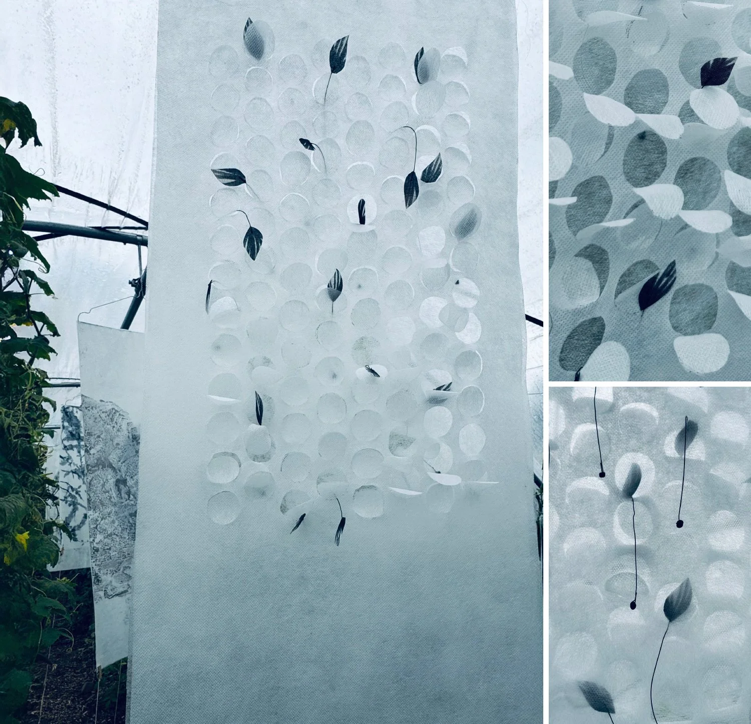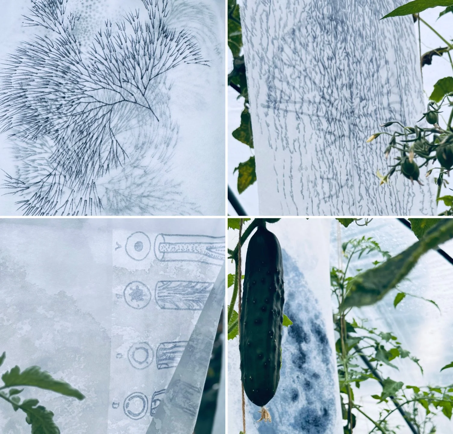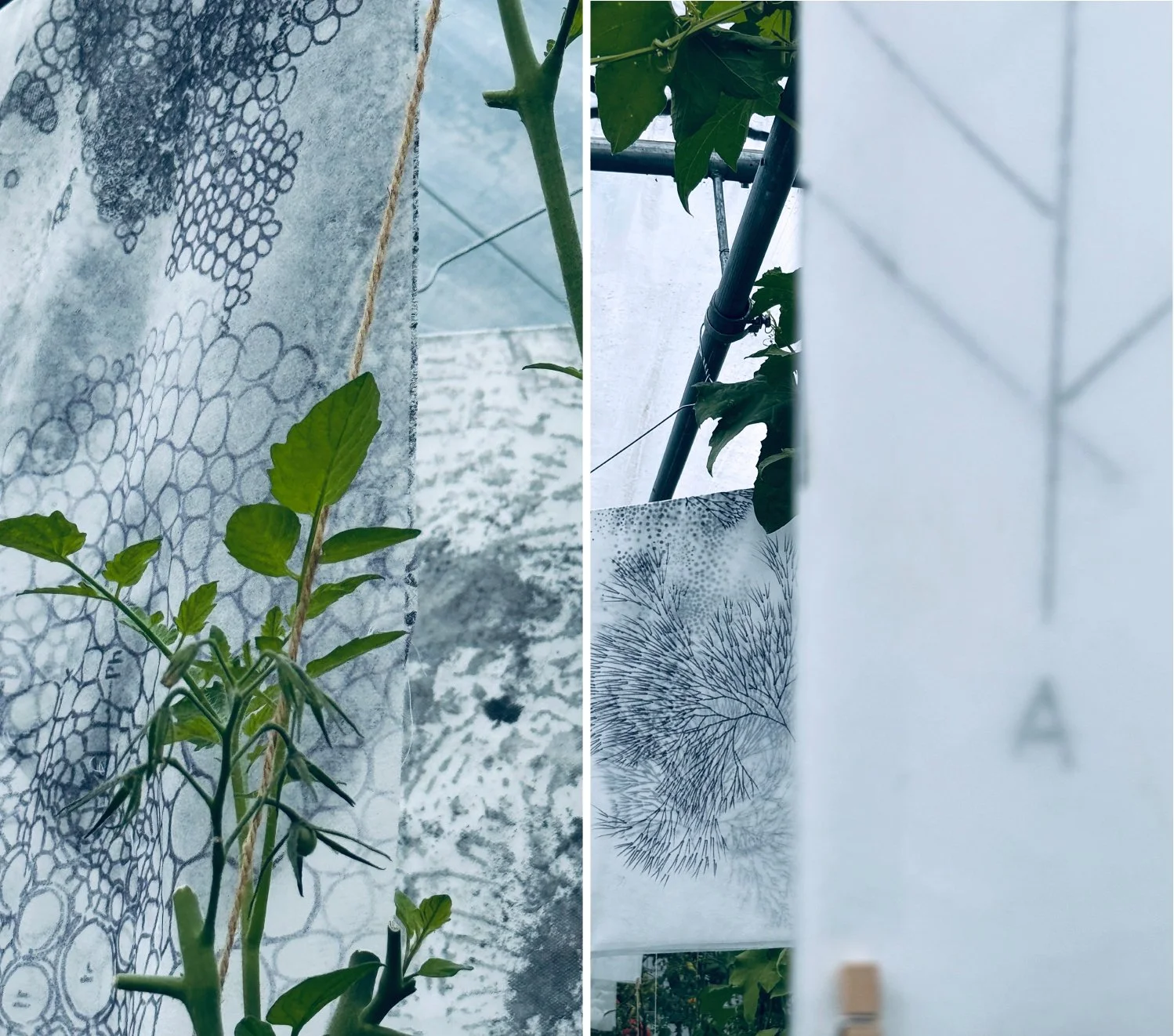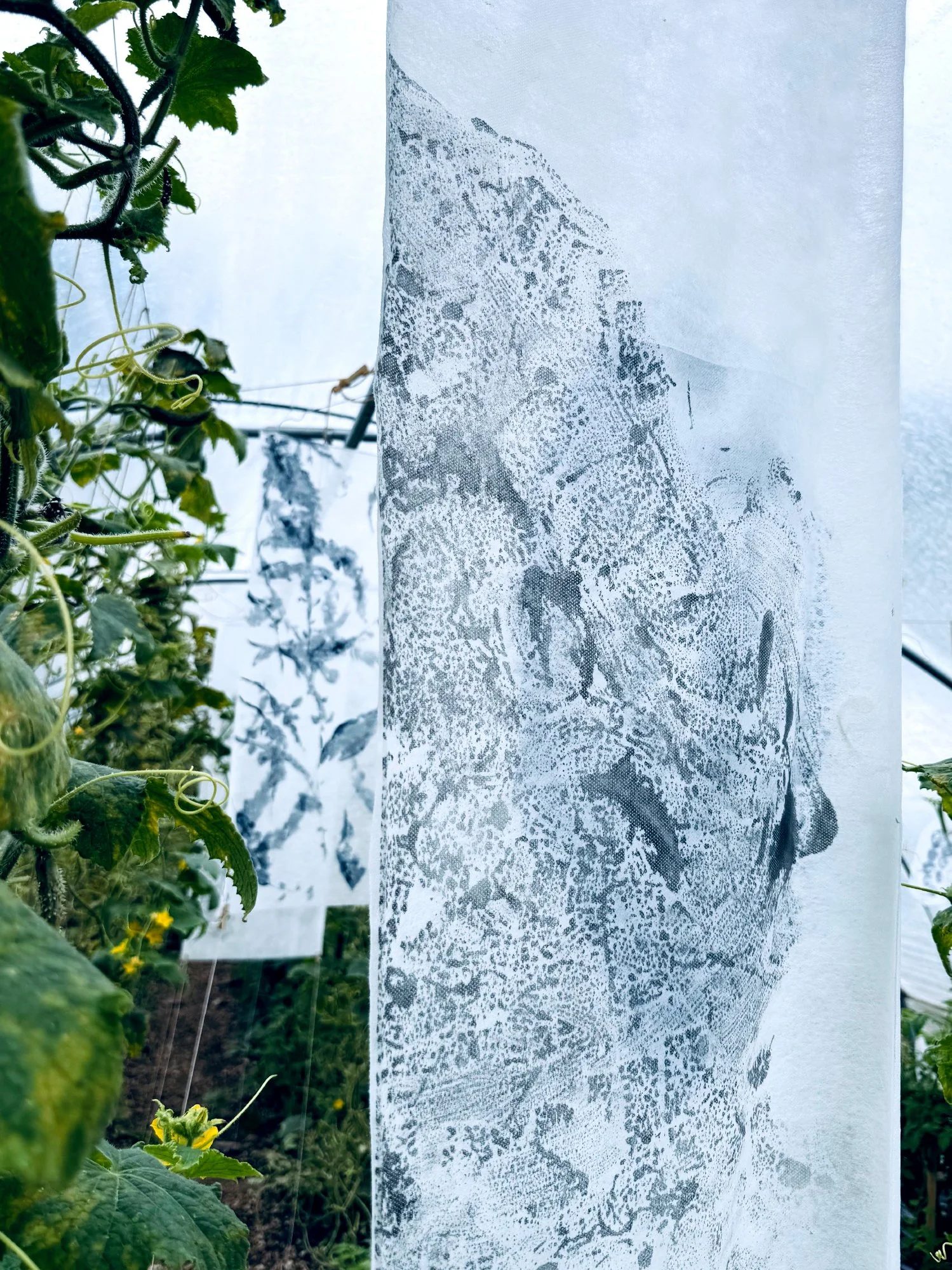 Ik laat me inspireren door de wetenschap achter de planten en de verwondering die het oproept. Ik maak werk om al deze schoonheid te onderstrepen. Om de aarde niet te belasten met mijn keuze voor materialen zoek ik wat er ter plekke aanwezig is en gebruik ik het als ondergrond voor mijn werk: landbouw vliesdoek. Dat wat de zaailingen beschermt tegen hongerige vogels en insecten inspireert me nu om zo luchtig mogelijk werk te maken. Ik wil dat de oogst de show steelt. Dat de bezoeker er langs loopt en door het kijken naar mijn observaties nog meer let op de vorm van de bladeren, de kleuren van de tomaatjes, de druppels op de baby augurk...