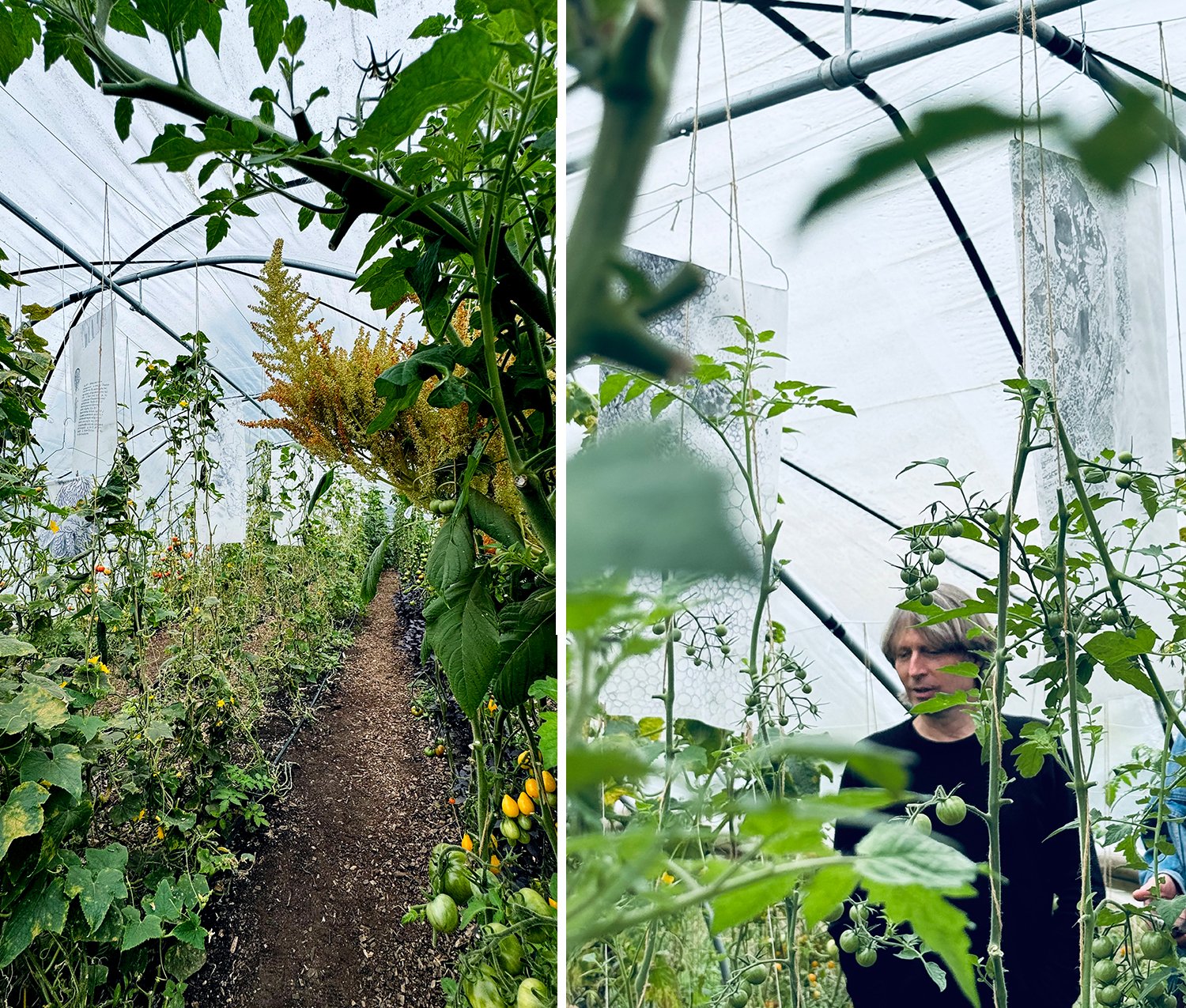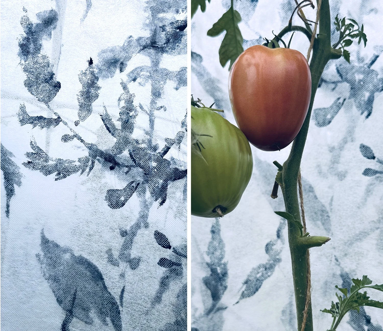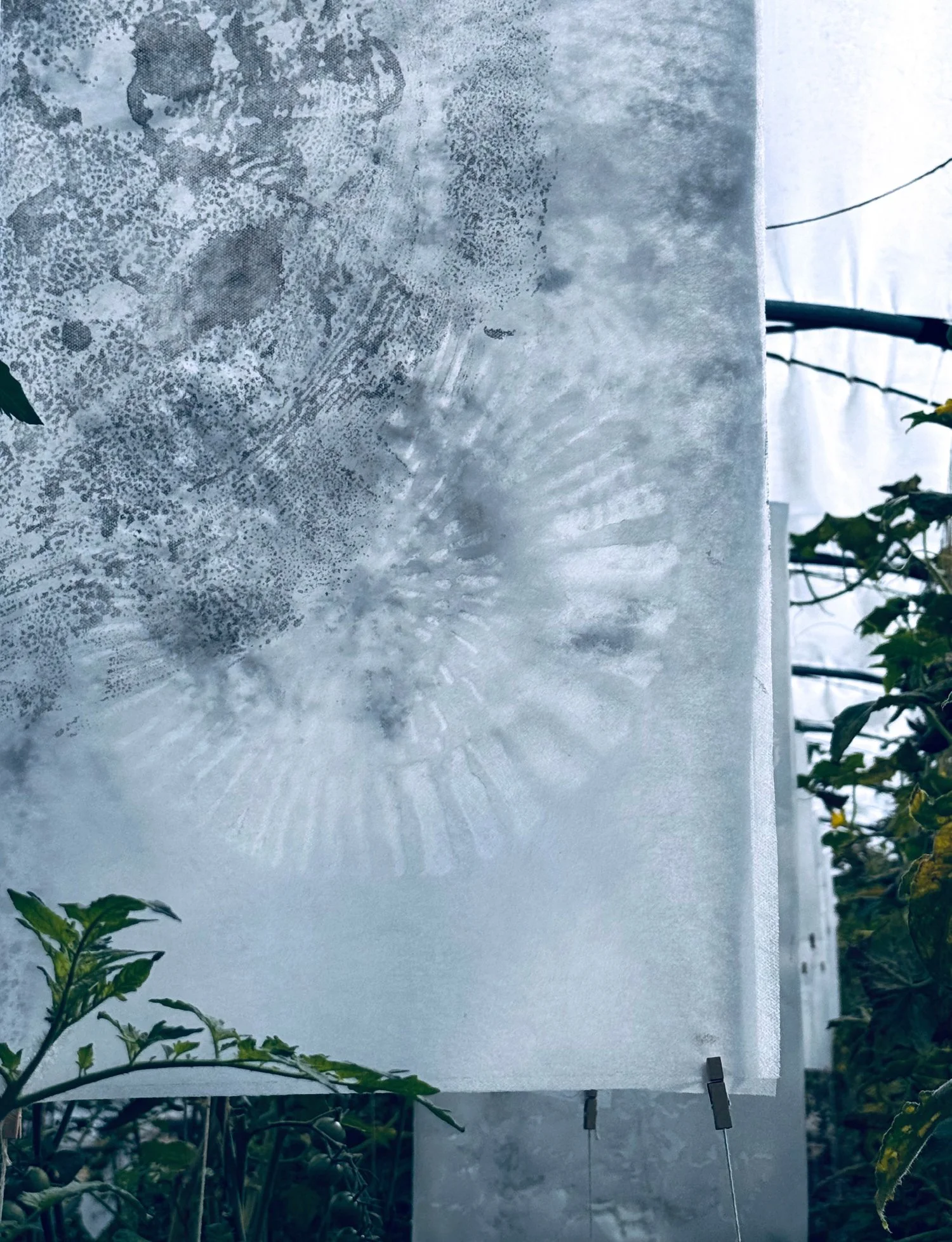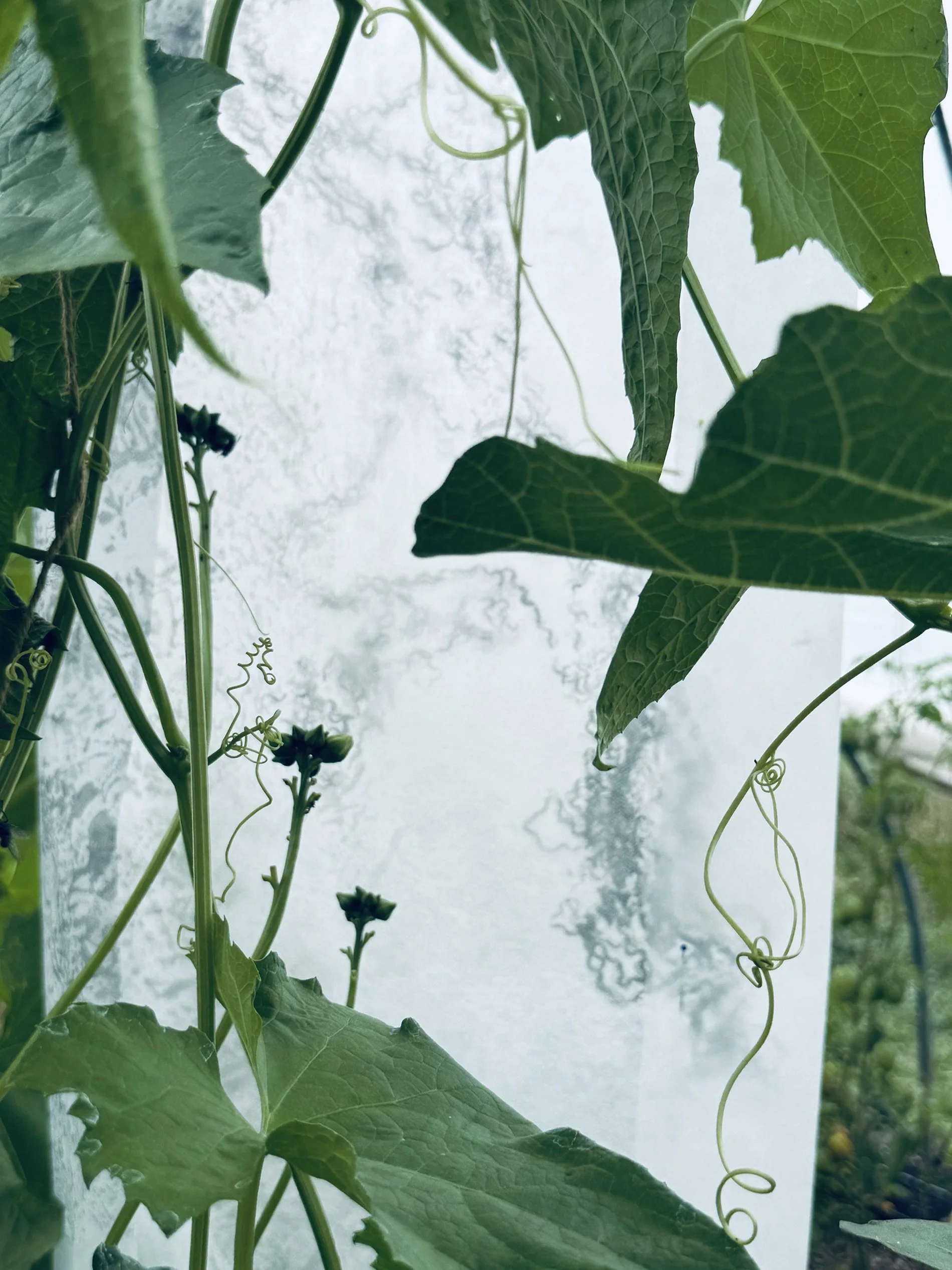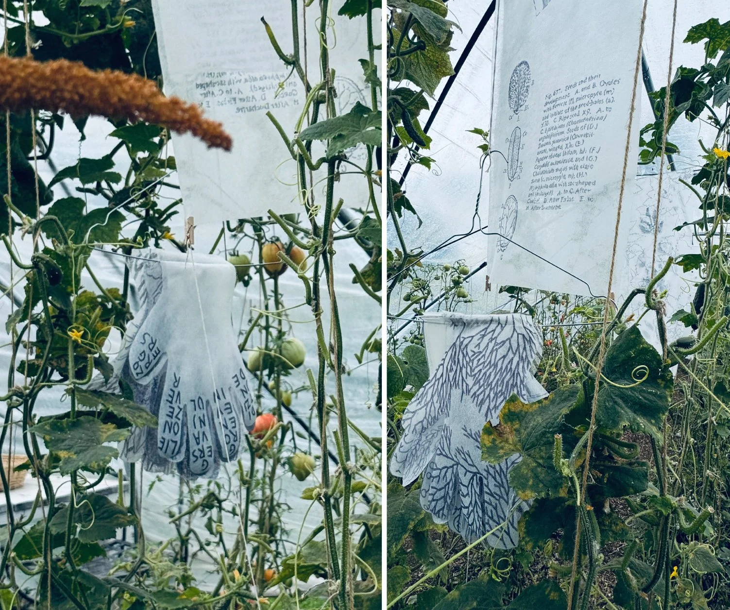 Ik laat me inspireren door de wetenschap achter de planten en de verwondering die het oproept. Ik maak werk om al deze schoonheid te onderstrepen. Om de aarde niet te belasten met mijn keuze voor materialen zoek ik wat er ter plekke aanwezig is en gebruik ik het als ondergrond voor mijn werk: landbouw vliesdoek. Dat wat de zaailingen beschermt tegen hongerige vogels en insecten inspireert me nu om zo luchtig mogelijk werk te maken. Ik wil dat de oogst de show steelt. Dat de bezoeker er langs loopt en door het kijken naar mijn observaties nog meer let op de vorm van de bladeren, de kleuren van de tomaatjes, de druppels op de baby augurk...