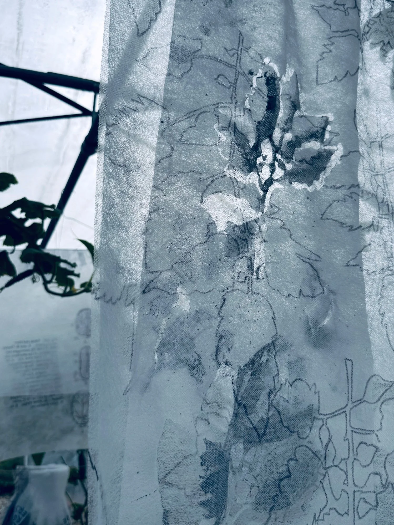 Getekende, geschilderde en geperforeerde lagen vliesdoek geven vorm aan mijn werk. Het licht, de schaduwen en de planten in de kas maken het af. Als de zon schijnt door de half transparante doeken ontstaat een beeld dat niet in de tijd gevroren is maar constant verandert.