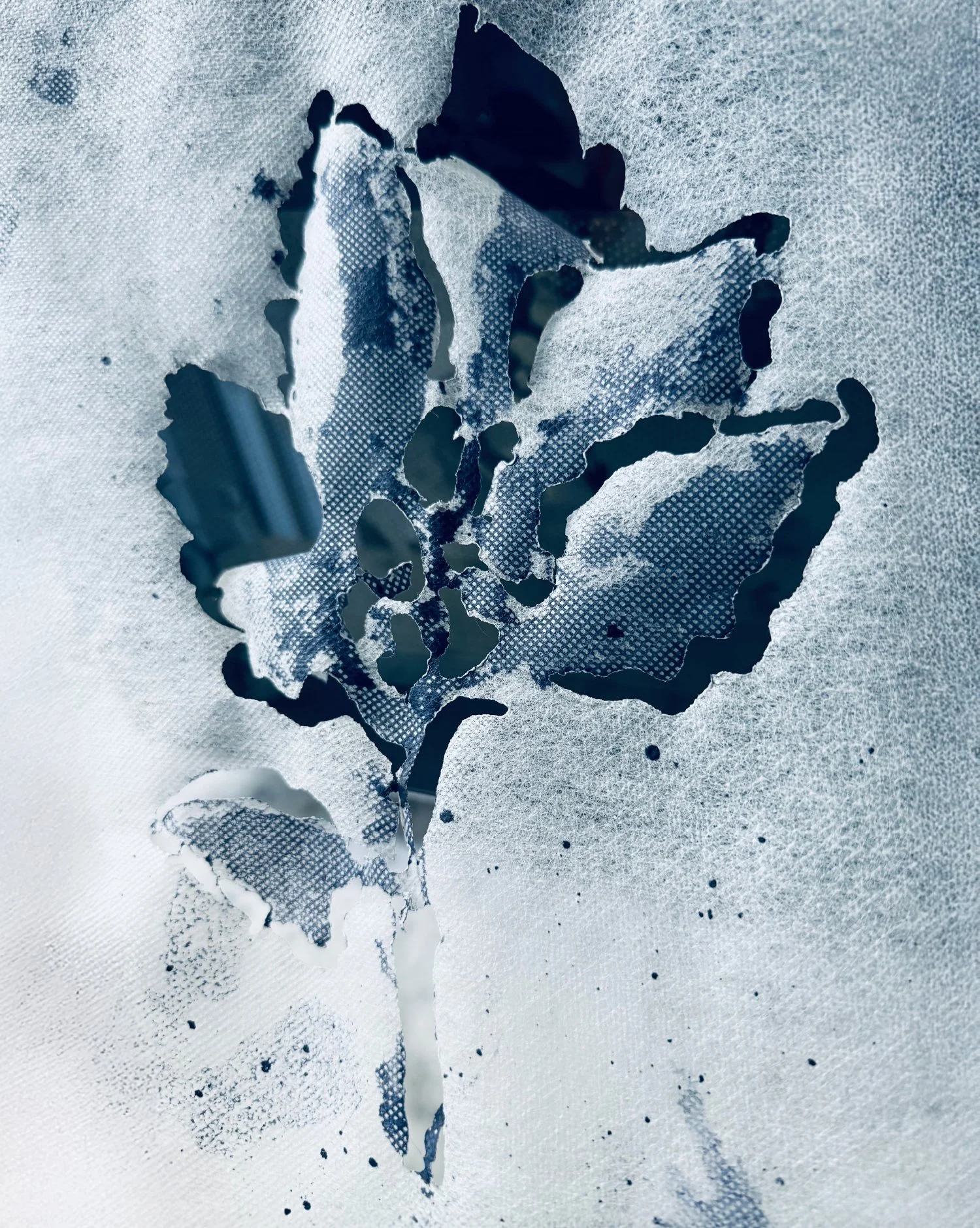 tomatenblad --- acrylverf en perforaties op halftransparant landbouw vliesdoek