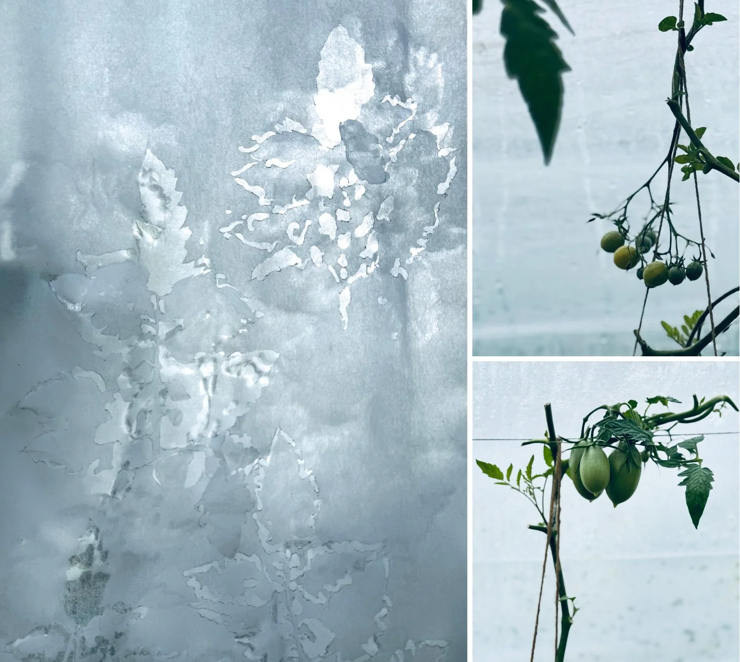 Een lege kas aan het begin van het jaar. De vraag om kunst te maken voor deze plek. Alleen al de belofte van wat er onder dit zijdezachte licht zal gaan groeien!